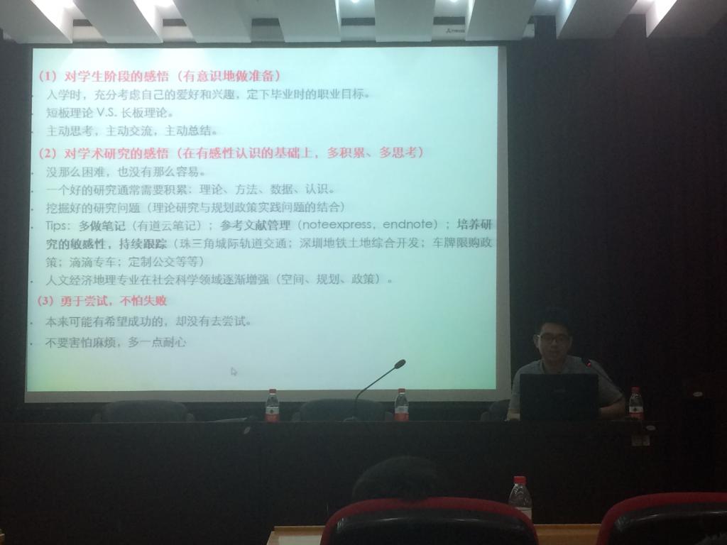 本次讲座林博士以“珠三角都市圈交通与土地协调发展”为主题,从综合开发、制度特征与优化策略三个层面对城市轨道交通发展的相关问题进行阐述,内容丰富、精彩纷呈。林博士首先介绍了研究问题产生的背景,从而揭示珠三角城市土地开发和交通之间的问题所在,研究方法主要采用了案例研究和政策研究,选取了珠三角城际轨道交通、深圳市地铁加物业开发以及中山市交通影响评价政策的实践三个典型例子,向同学们详细介绍了珠三角地区地铁用地开发模式及交通与土地利用协调发展研究等方面的专业知识。随后,林博士与同学们交流了他在攻读硕士以及博士在读期间的一些感悟,鼓励同学们要主动思考,主动交流,主动总结,在学术研究方面要多积累多尝试,不怕失败,同学们听后均表示受益匪浅,感触良多。