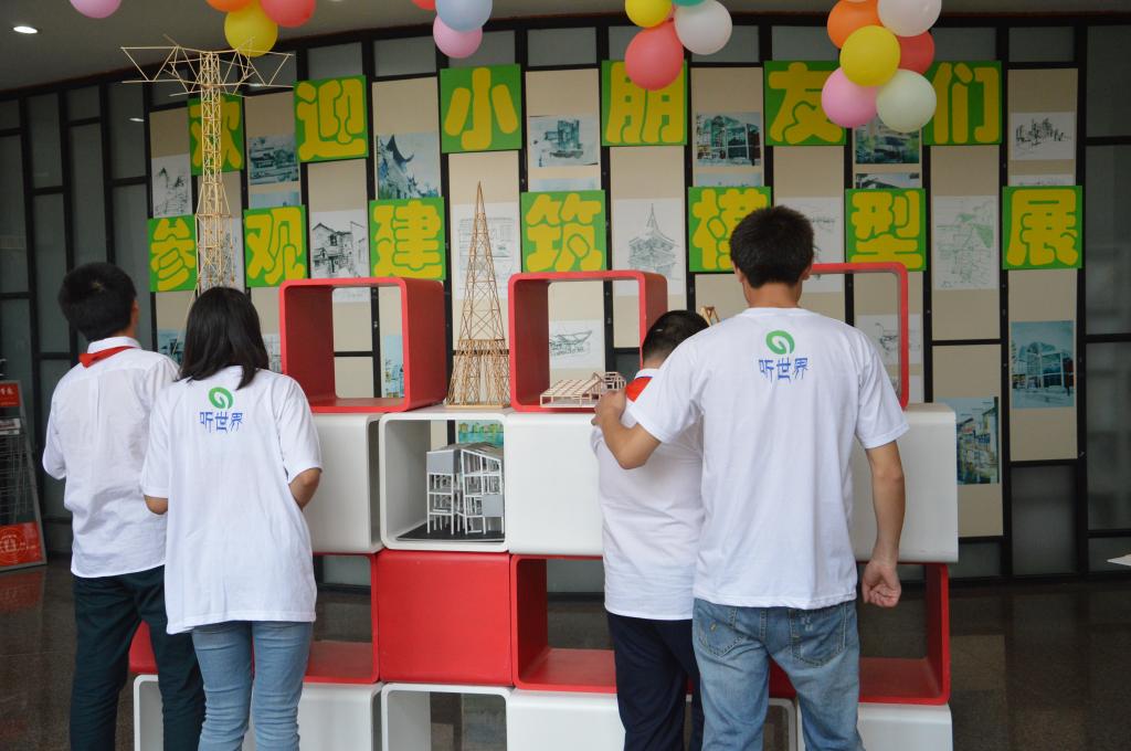 随后带领盲童来到思禹建工楼,在这里有志愿者们为小朋友们精心布置的建筑模型展。普通人可以用双眼观赏精致的模型,而盲童则要通过双手缓慢小心的触摸,仔细地感受我们平时所住的房子和建筑的模样。