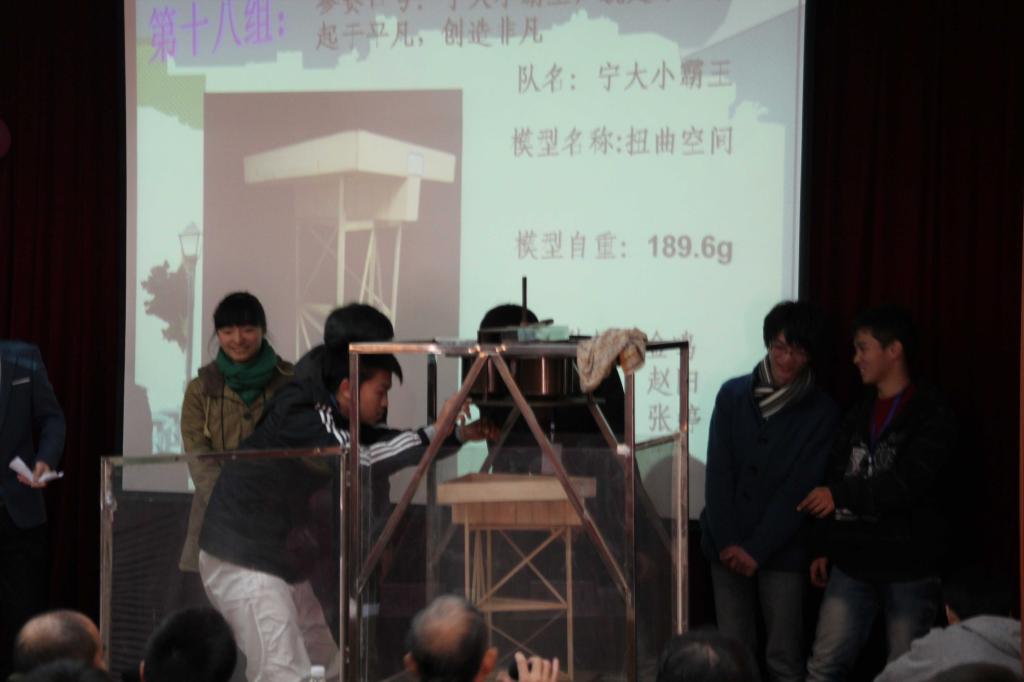 当天,报告厅被彩色气球环绕,墙壁周围有选手以及参赛作品的照片、简介和参赛宣言,现场气氛紧张而不失欢乐,严肃却不乏活泼。介绍完嘉宾和评委之后,大赛工作人员上台介绍比赛规则,并进行加载演示。评分由选手自述答辩、结构体系、美观与制作和加载性能四部分组成。竞赛的关键是加载试验,加载性能不仅取决于加载重量,还与结构本身自重有关。最终,经评委打分共产生一等奖3名,二等奖6名,三等奖9名。