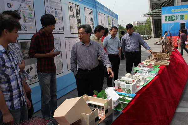 学生展示了具有建工特色的科技创意作品,吸引了许多市民驻足观看,区委副书记、区长陈召华还就污漫