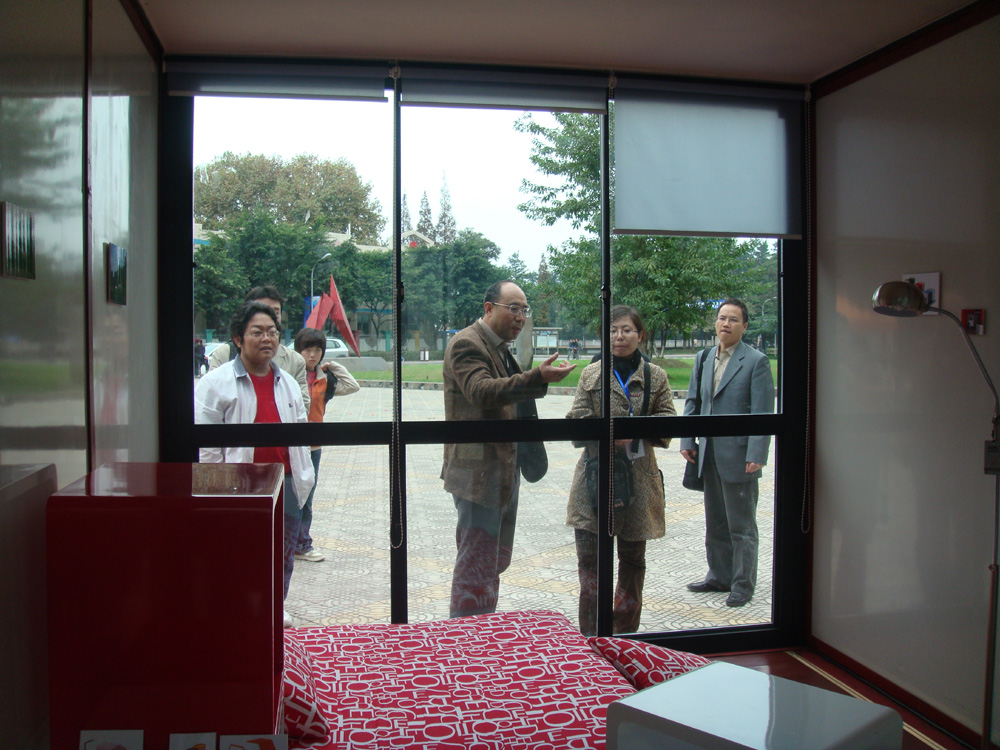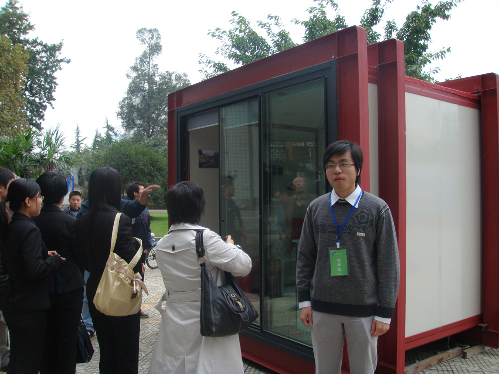 “M-home特种用房有限责任公司”创业团队的设计作品为新型简易环保住房,主要针对建筑工地、旅游区、灾区等所需的临时建筑要求进行设计的。M-house,意为“我的家”,红色屋顶,白色墙壁,看起来非常美观。采用钢架折叠结构,折叠后占用空间较小,运输便捷,安装方便。它可以三个叠加在一起,占用土地的面积更小。在房间内,还有一套可折叠式的简易家具,生活的舒适度会更高。其墙体采用隔温、防雨的高科技材料制成,可以避免日光烘烤带来的闷热问题。用四个“小腿”来固定地面,经模拟测试可以抵御10级以下的大风。比起活动板房来,它少了用水泥固定地面的繁琐,避免了水泥对土地的破坏,因此更加环保。另外,M-house一个独特的优势就是重复利用率接近100%。设计者蔡小斌说,普通的活动板房在拆除后,其材料二次利用度仅为45%到60%,而拆除后,除个别零件需要必要的修复外,几乎无需添加任何材料就能再次使用。