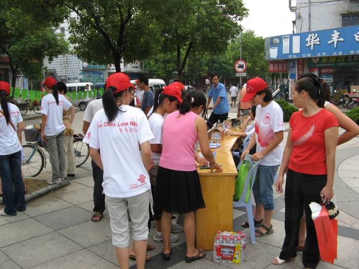 省级社会实践基地,庄市街道团工委给予本次暑期社会实践活动大力支持。本次社会实践活动包括生态、环保、奥运知识宣传;废物利用小制作展览;奥运小知识有奖竞猜等。作为宣传服务的最后一站,实践团队把地点定在庄市街道联兴村移动公司广场,队员们7点就来到活动场地进行布置,8点宣传服务工作准时开始,当地居民对活动报以极大的参与热情,驻足观看废弃物品制作的精美小饰品,认真聆听实践队员们的生态环保小知识讲解,踊跃参与奥运小知识有奖竞猜活动,整个现场形成良好互动氛围。