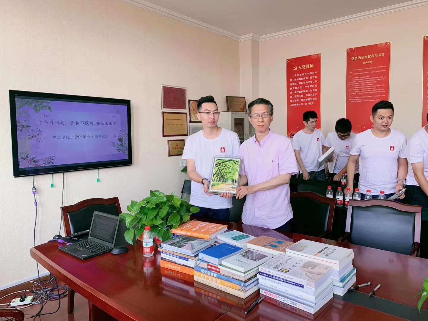 会上,郑院长首先对返校重聚的校友们表示热烈欢迎,之后介绍了学院目前总体情况。紧接着,各位同学逐一汇报了自己最新的情况,最后05土管专业同学也为学弟学妹们捐赠了50余册汇集了土木前沿研究成果的书籍,院长出席捐赠仪式。会后,老师们与校友们在学院大厅合影留念。