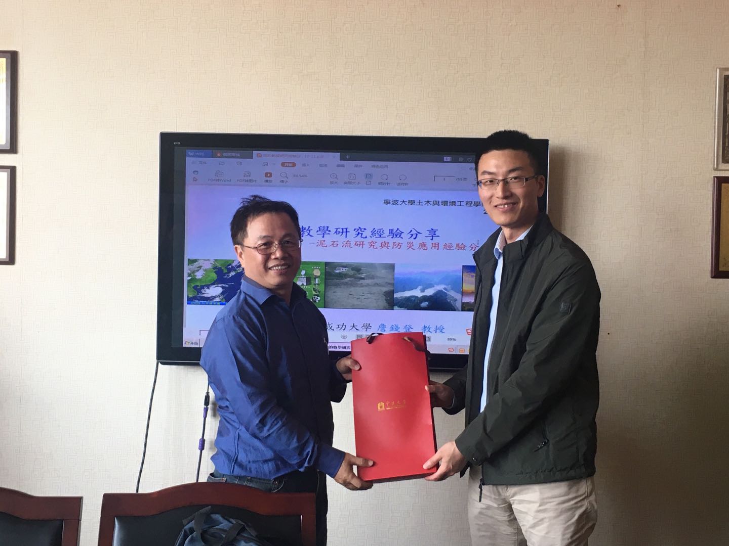 2019年10月21日中国台湾成功大学水利及海洋工程系特聘教授詹钱登应邀来污漫 进行学术交流,并做了题为“泥石流研究与防灾应用经验分享”的讲座。院长助理章子华热情接待了詹钱登教授。詹钱登教授从泥石流研究与防灾应用的主题出发,结合自己在求学、任教、科研和服务社会过程中的经历和感悟,与参加本次讲座的师生进行了深入交流。
