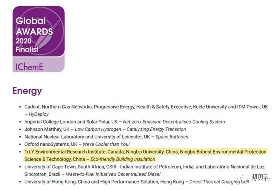 2020年9月14日,英国化学工程师协会 (The Institution of Chemical Engineers, IChemE) 公布了2020年度全球奖入围优胜获奖名单 (IChemE Global Awards 2020 Finalists),绿色建筑保温材料 (Eco-friendly Building Insulation) 获得能源奖项 (Energy Award), 奖项合作单位为:加拿大查韦环境研究院;污漫 ;宁波博贝科环保科技有限公司
