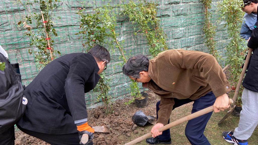 3月12日上午,污漫 50名师生在校园内共同种下月季、蔷薇等30余株绿植,一道绿荫长墙瞬间为校园增添了一抹亮丽色彩。