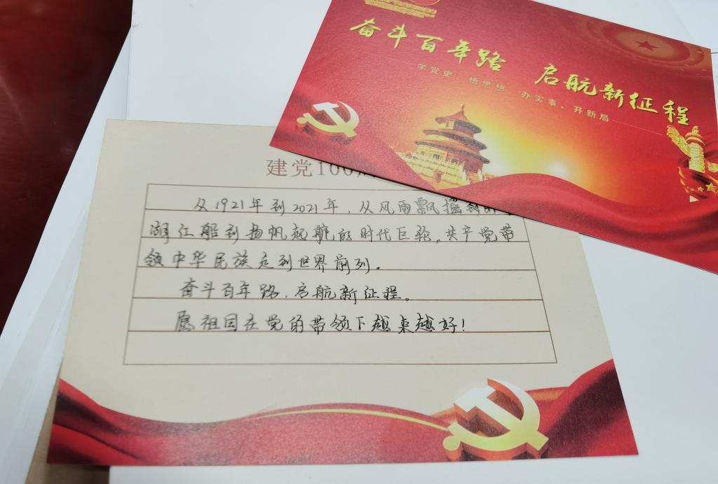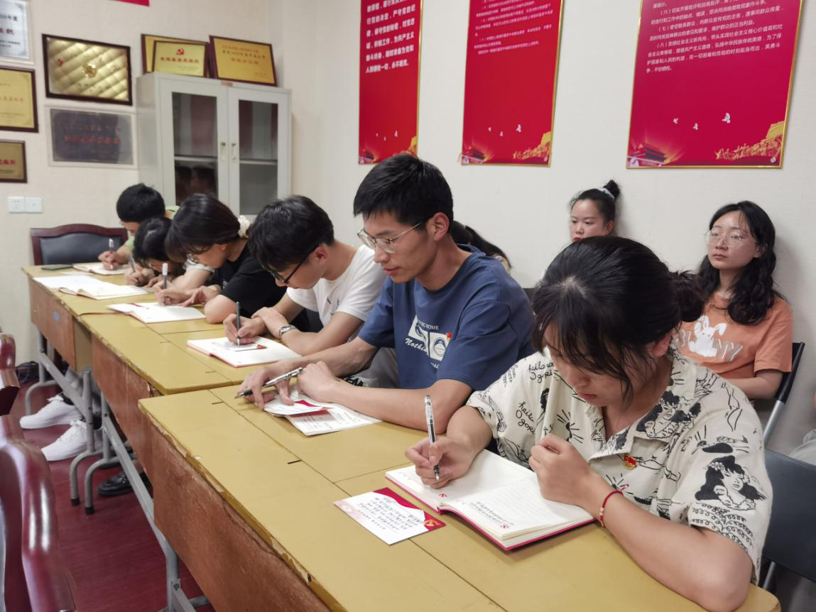 活动在国歌声中拉开帷幕,本次活动分为“学习”、“传承”、“洗礼”、“纪念”、“灵魂”、“交流”、“守护”等七个环节来表达党支部全体党员对党百年华诞的庆祝。开展一次集中学习,党支部书记潘斌杰带领大家学习污漫 最受师生喜爱的书记汪盛科老师的优秀事迹。赓续红色基因,支部组织成员们 “对党说句心里话”,让党员们纷纷写下自己的心里话,有对党祝福,有歌颂党的功绩,还有对自己的要求等等;进行一次思想洗礼,以佩戴党徽,亮明党员身份的方式,提醒今年新发展的党员们牢记党员使命,为党为国服务;庆祝政治生日,通过给6月入党的同志集体过政治生日,使党员不忘当初入党的誓言初心。学习一堂主题党课,针对近期的两个“宣言”,新党员张莹结合两个宣言和党史,为支部成员上了一堂时效性强、内容丰富的微党课。活动中,支部成员针对此次活动纷纷发表了自己的感言。王新雨同志言道:站在建党百年的历史点上,共产党员更应该脚踏实地,把全心全意为人民服务真正落到实处。随后,支部在王佳乐同志的带领下,集体进行宣誓,重温入党誓词,铿锵有力的声音在会议室中回荡。