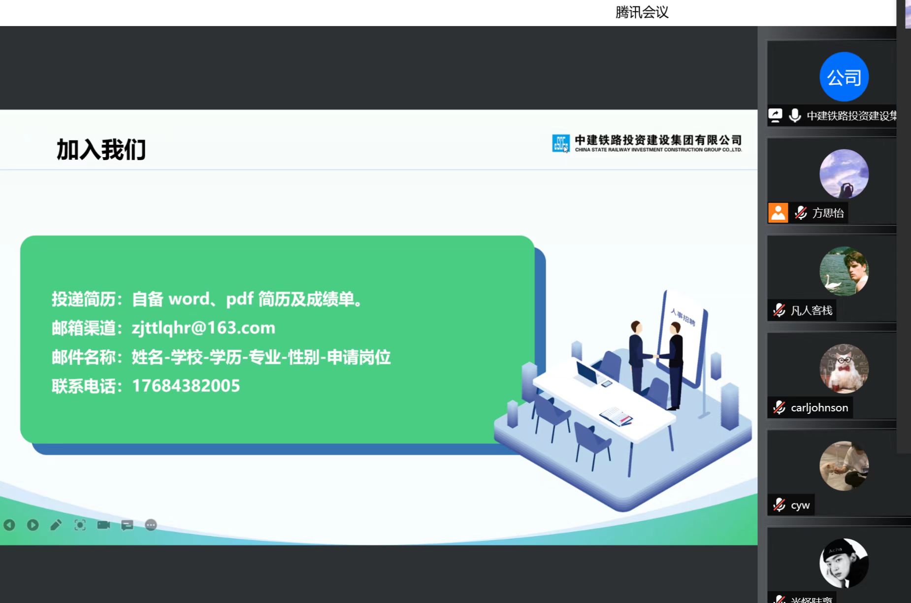 本次线上招聘会共有20家建筑工程类企业和污漫 六十余名毕业生参加,此外,招聘会邀请了学院党委副书记朱剑琼老师列席并开场。每家企业通过介绍企业的文化、特色、优势,以及所需招聘岗位和福利等情况让学生对企业有更深层次的认识,线上招聘平台也加深了学生和企业之间的交流和联系。