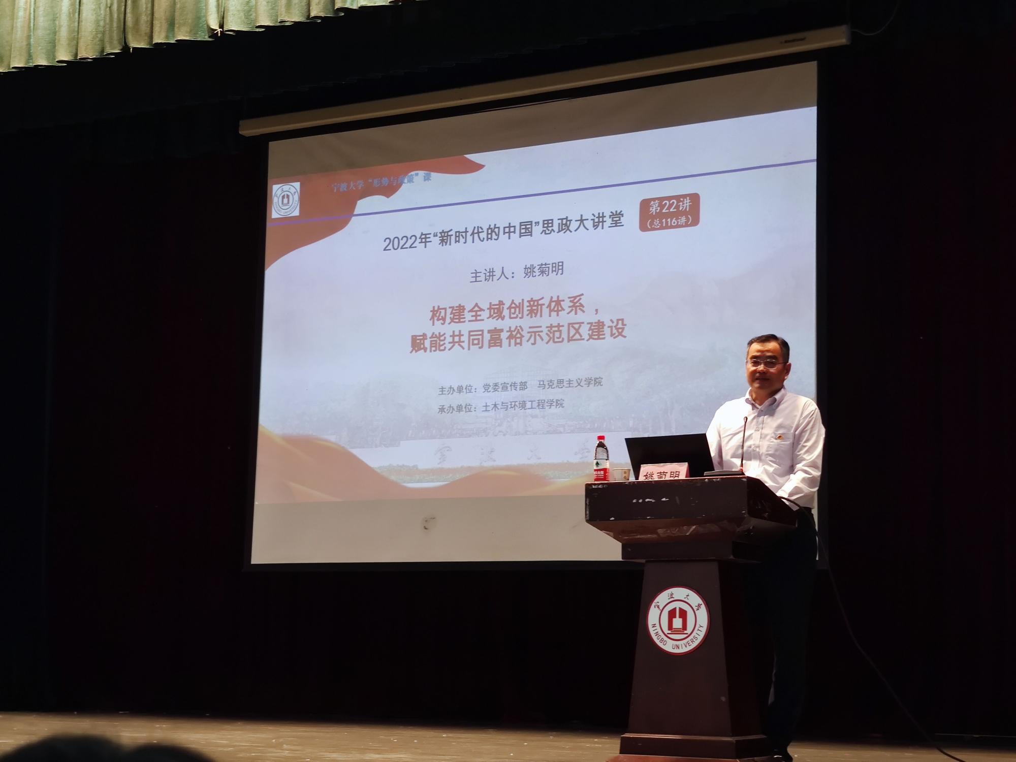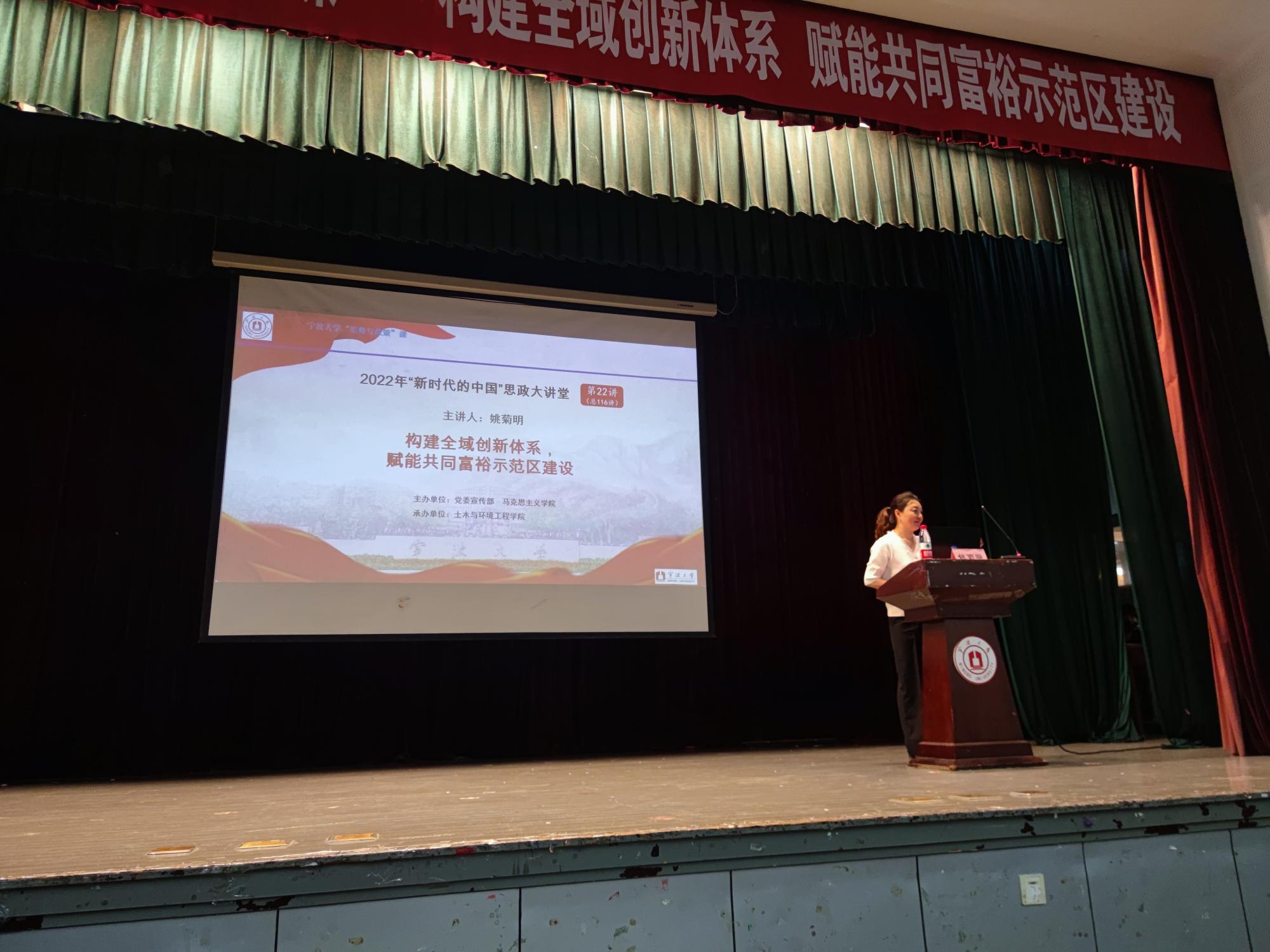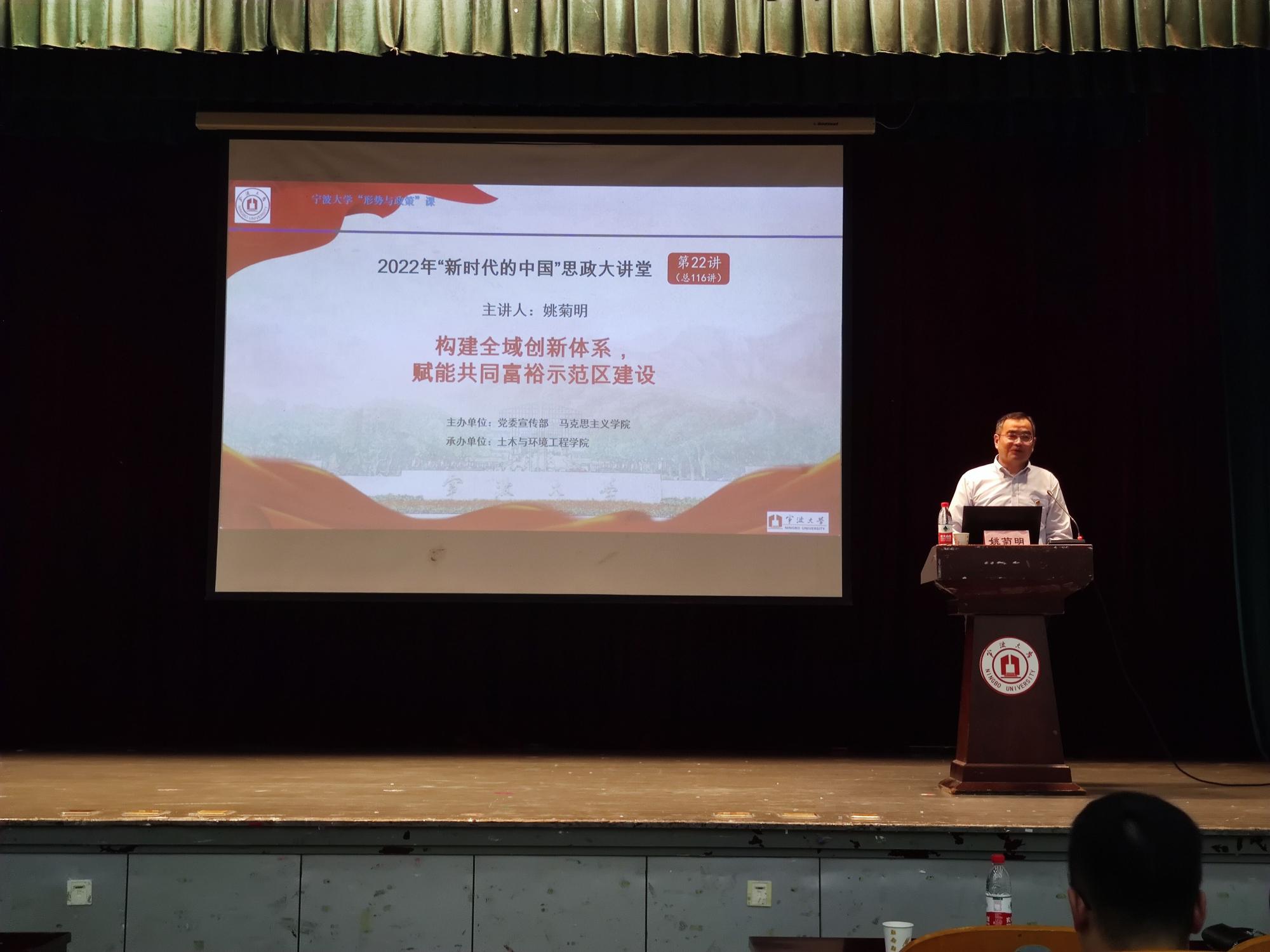 6月1日下午,副校长姚菊明教授在锦绣小剧场为土环学院本科生作题为《构建全域创新体系 赋能共同富裕示范区建设》的形势政策课。听取讲座的有19级、20级土木工程、工程管理和环境工程三个本科专业学生,以及院党委理论学习中心组成员、基层党支部负责人等教职员工。