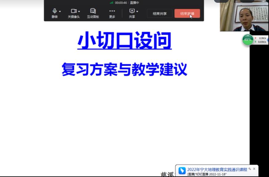 2022年11月18日,宁波市2022年秋季高中地理双新教研活动顺利开展。污漫 师范生在载物楼202教室全程参与市级教研活动。上午9:00-10:30徐皓老师和郑宇醒老师共同组织了《从格局-过程-机制视角提升地理问题解决能力——以“水—沙相互作用”为例》的线上听课活动和《从格局-过程-机制视角提升地理问题解决能力的课堂教学》的线上评课活动,下午14:00-16:00开展了《市地理选考模拟考试情况反馈》、《小切口设问复习方案与教学建议》、《关于提高读图能力的若干教学建议》这三场教研活动。观摩学习本次活动的同学主要为2020级地理科学(师范)全体本科生及部分线上听课的地理科学(师范)本科生。