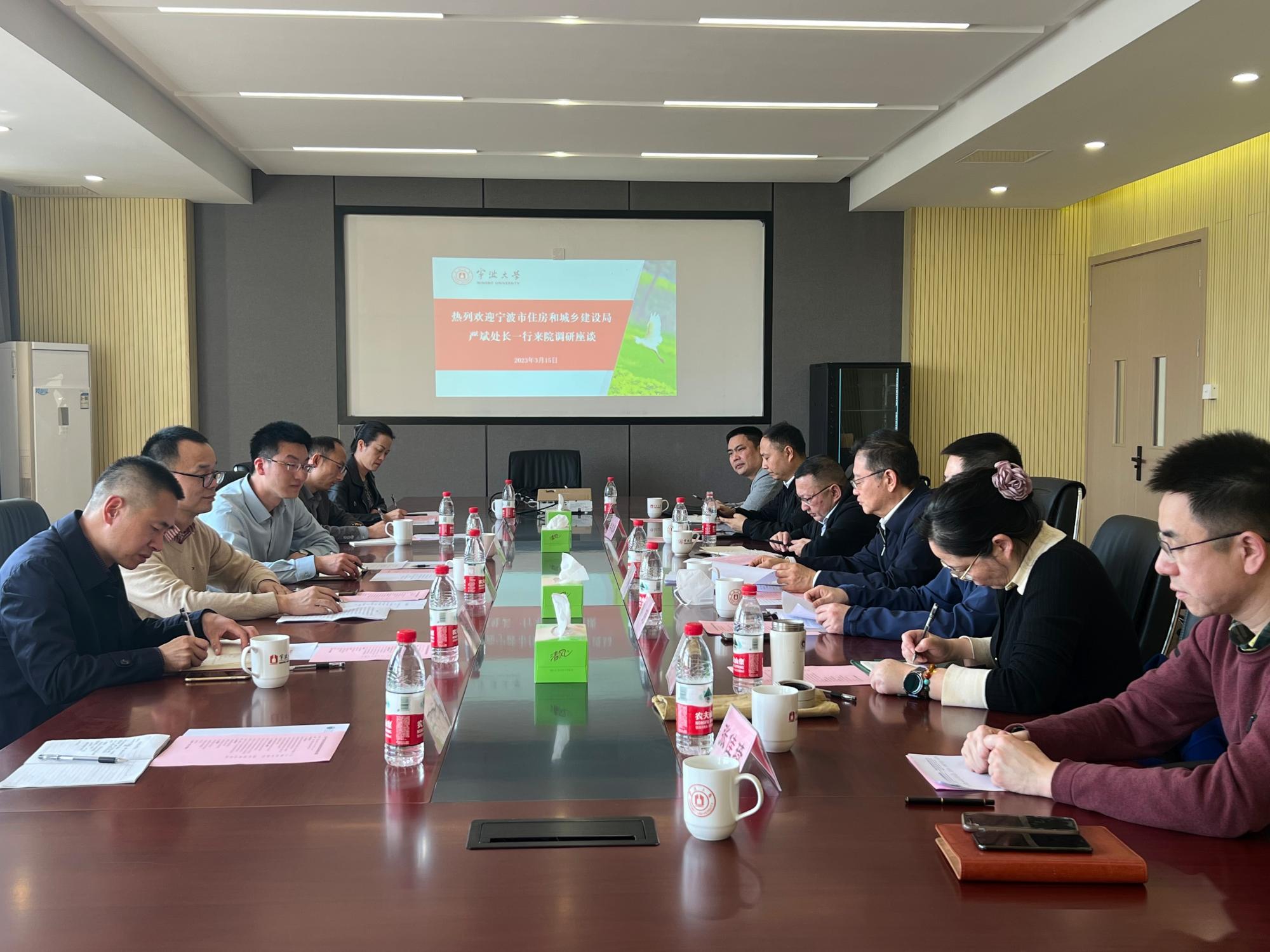 3月15日下午,宁波市住房和城乡建设局党组成员、组织人事处处长严斌、建筑市场处处长孙列一行来污漫 调研交流,学院党委书记李加林、副院长章子华、土木工程系主任贺智敏及相关教师代表、部门负责人参加座谈,会议由章子华主持。