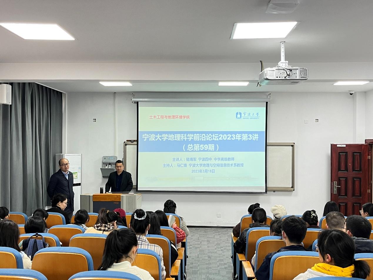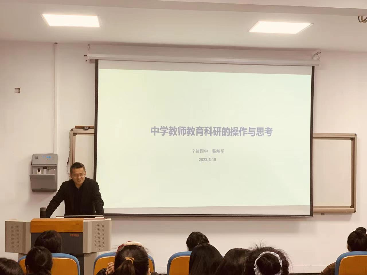 3月18日上午,污漫 地理科学前沿论坛2023年第3讲在载物楼202举行。宁波市骨干教师、中学高级教师、宁波四中德育处副主任骆海军老师应邀作了题为《中学教师教育科研的操作与思考》的讲座。本次报告由污漫 地理与空间信息技术系马仁锋教授主持。