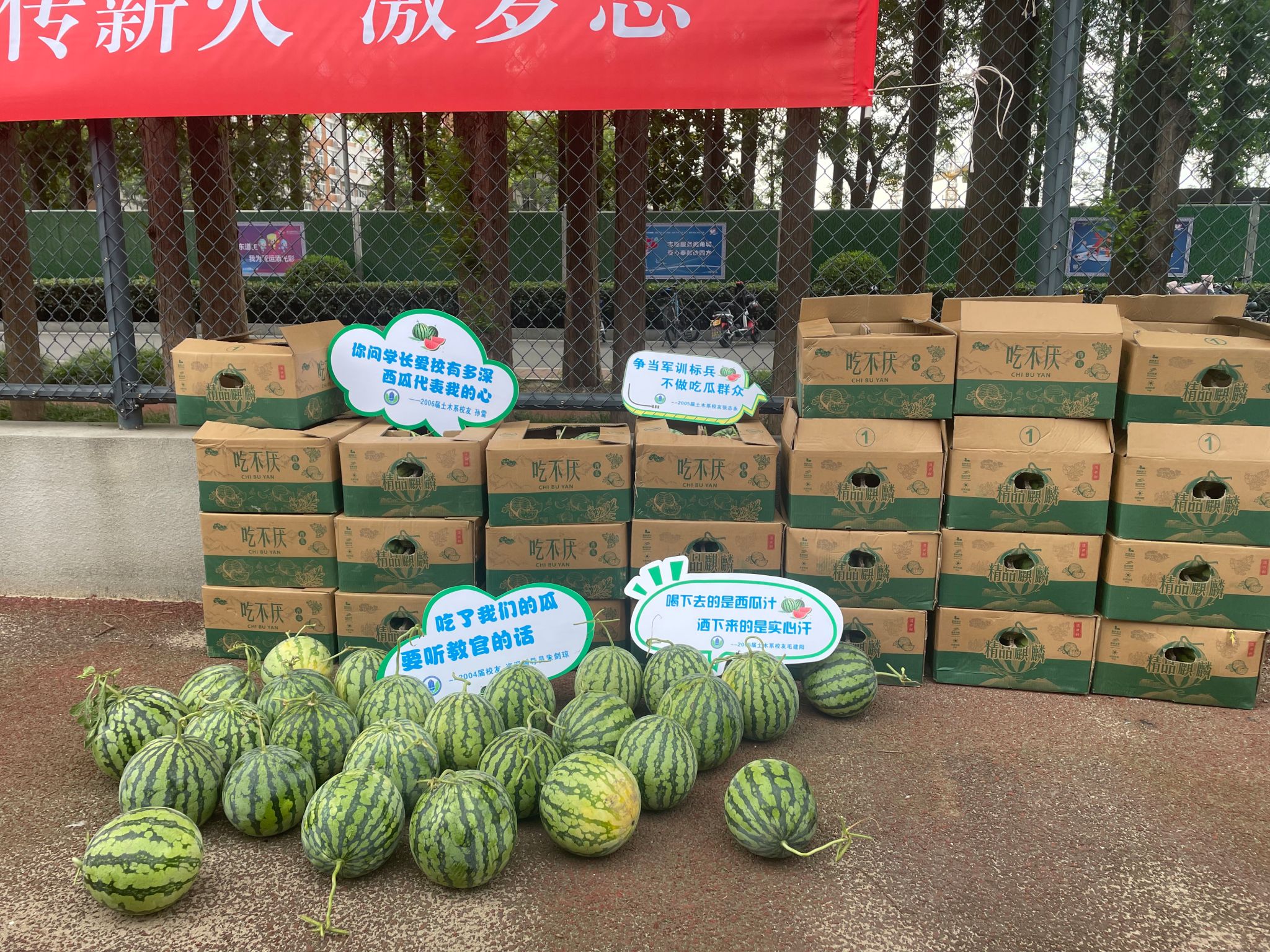 一个个圆滚滚的大西瓜整齐地摆放在场地上,也甜在了同学们的心坎上。22级同学们有序领取,纷纷抱回了凝聚着爱与鼓励的美味,脸上洋溢着快乐和满足。“分瓜”时刻,两位师兄还不忘鼓舞同学们要珍惜大学时光,克服困难,保重身体,努力争当优秀学员......因在外地出差、无法赶到现场但慷慨出资的2005届土木系校友张志永也远程发来问候,希望学弟学妹们要“争当优秀学员 不做“吃瓜”群众”。