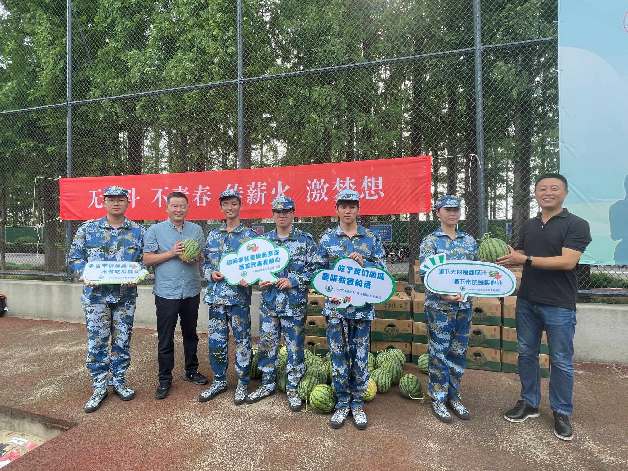 6月30日上午,夏日当空,烈日炎炎。污漫 2022级学生军训正如火如荼地进行着。操场上的同学们身姿矫健、挥汗如雨。不多久,学院党委副书记朱剑琼携土木系2005届校友毛建阳,2006届校友孙雷为参训的同学和教官们送来了爱心福利——一千斤西瓜,以表达学院和校友的慰问,为同学们消暑降温、加油鼓劲。