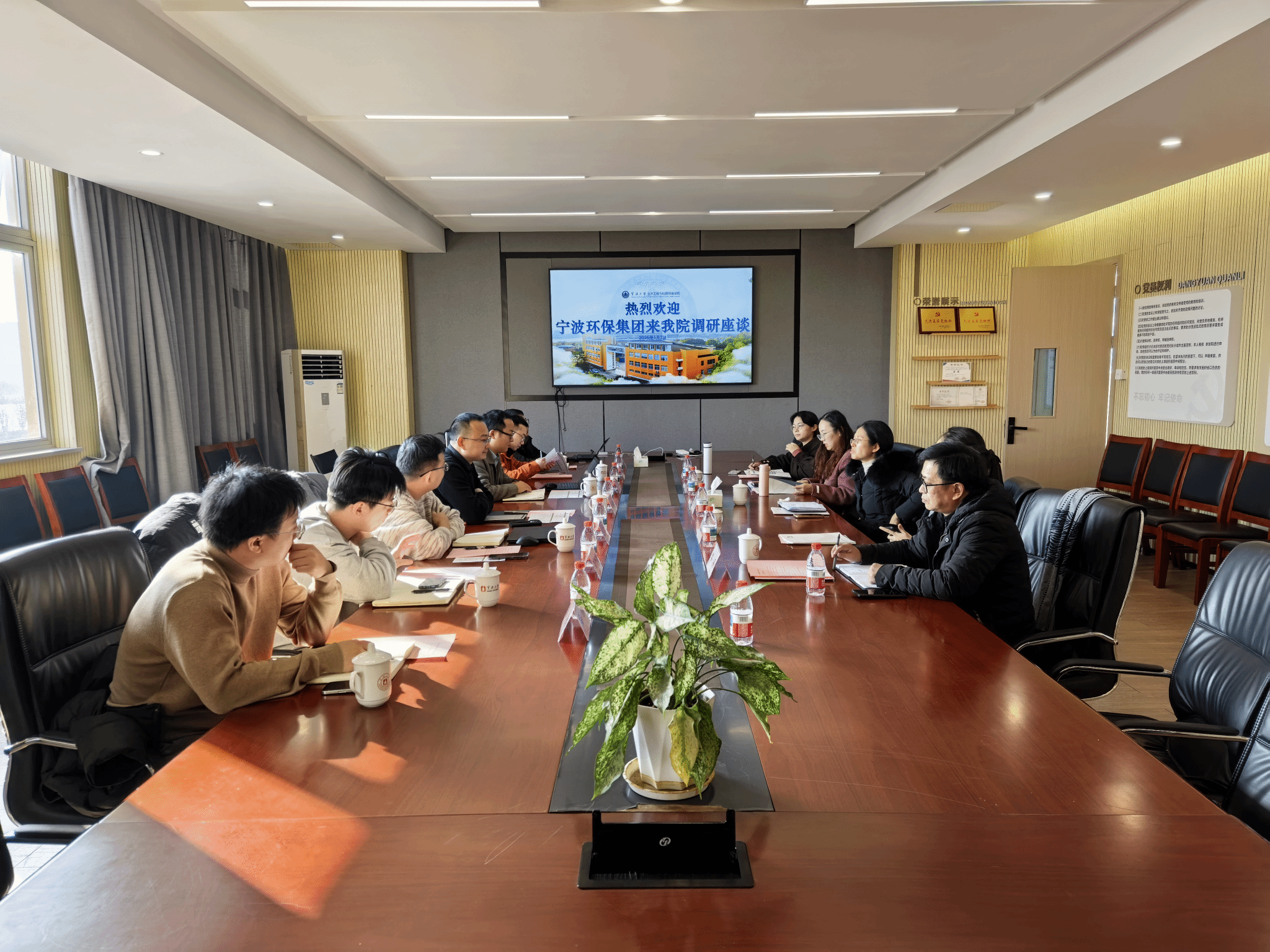 会上,宁波环保集团结合行业发展需求,介绍了城投集团及环保集团在城市环境治理、环保项目运营、绿色低碳技术应用等方面的实践经验,以及当前在生态环保领域面临的技术瓶颈与合作诉求。污漫 副院长对宁波环保集团的到访表示热烈欢迎,详细介绍了学院在生态环境治理、低碳技术研发、污染控制工程等领域的学科优势、科研平台建设及人才培养成果,重点分享了相关团队在水环境修复、固体废物资源化利用、环保材料创新等方向的最新研究进展。