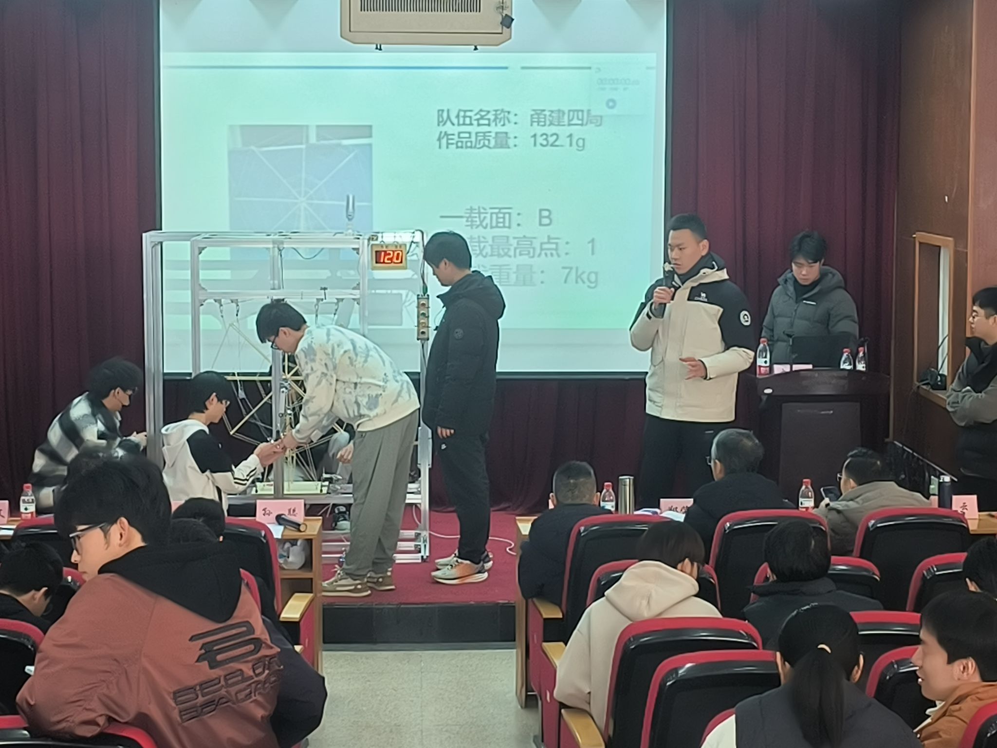 本届竞赛以“创新结构·极限承重”为核心挑战,参赛队伍需在规定时间内完成理论答辩与加载测试。比赛现场,选手们通过精密计算与巧妙设计,用竹皮、胶水等基础材料制作出兼具轻量化与高承载力的结构模型。在紧张刺激的加载测试环节,各团队依次接受竖向静载、动态冲击等多重考验。