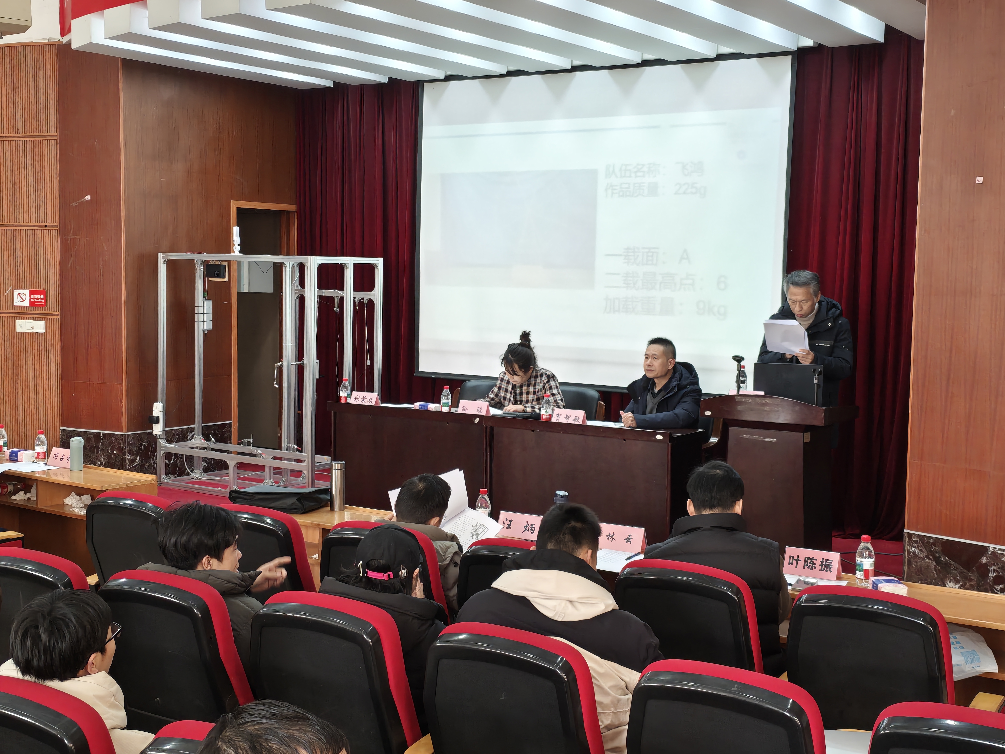 上午8:30,竞赛在庄严的开幕式中拉开帷幕。开幕式由贺智敏老师主持。教务处副处长孙聪出席并致辞,她强调:“结构设计竞赛是培养创新实践能力的重要平台,希望同学们以赛促学、以学促用,在挑战中锤炼工程素养。”随后,竞赛专家组组长郑荣跃教授详细宣读了比赛规则,为赛事奠定公平、专业的基调。