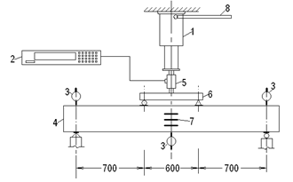 试验方案和测点布置如图4—2所示。图中:1—手动机械式螺旋千斤顶;2—应变仪(YE2538);3—挠度计或百分表;4—试件;5—拉压力传感器;6—分配梁;7—应变片;8—千斤顶摇柄。