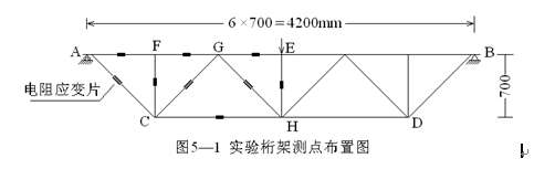 1、试件为一钢桁架,跨度为4.2m,上下弦及腹杆采用等边角钢2∠50×4,节点板厚δ=4mm,单根截面积=0.3897cm2,测点布置见图5—1所示。
