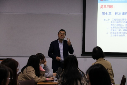 在本次课程开始之前,俞炯志老师带领同学们简单回顾和梳理了上次讲授的有关校本课程领导和区域、学校两个层面课程领导的相关知识,共同巩固先前的学习内容。随后俞老师讲解分析了有关知识管理与校本课程的实施的基础概念,回答了学校和教师不同主体如何运用知识管理发展校本课程的问题,最后介绍了校本课程实施的动力保障,讲述了教师的课程意识、课程信念的作用。