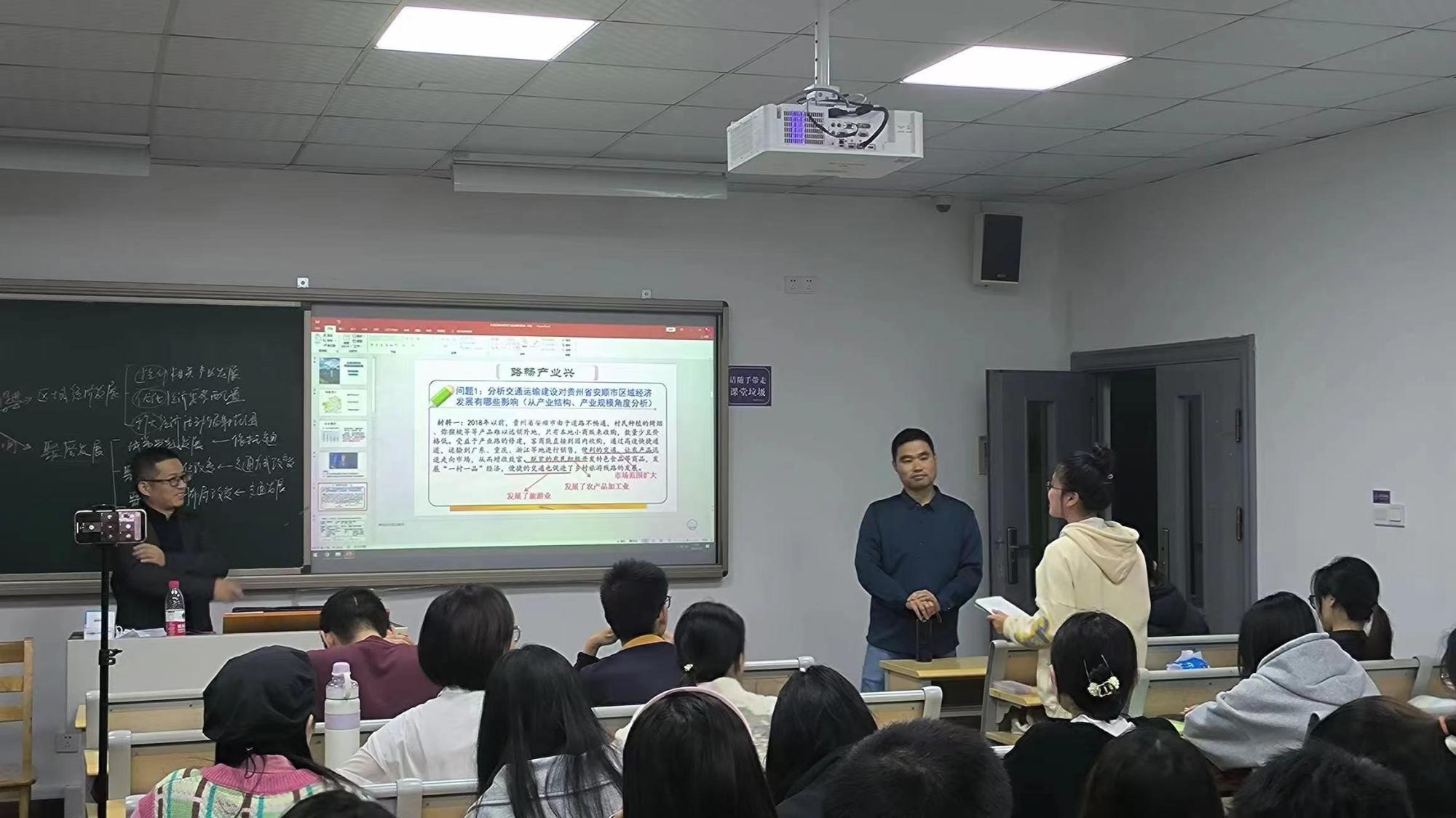 本次活动邀请到宁波四中的骆海军老师主讲,骆老师历任宁波四中地理教学组长、学部主任,现宁波四中德育处主任,宁波市优秀教师、高中地理骨干教师。徐皓老师简单介绍骆海军老师后,全体同学鼓掌表示欢迎。接着,骆海军老师一声“上课!”将同学们立马带进了高中地理课堂,同学们聚精会神地听讲。骆海军老师用贵州安顺脱贫致富的案例串联全课,通过鼓励学生阅读材料,自主总结归纳,设置问题层层深入,坚持“以学生为中心,教师为主导”的思想,运用结构式板书,梳理课堂知识点,帮助学生理清逻辑,建立完整的知识体系。