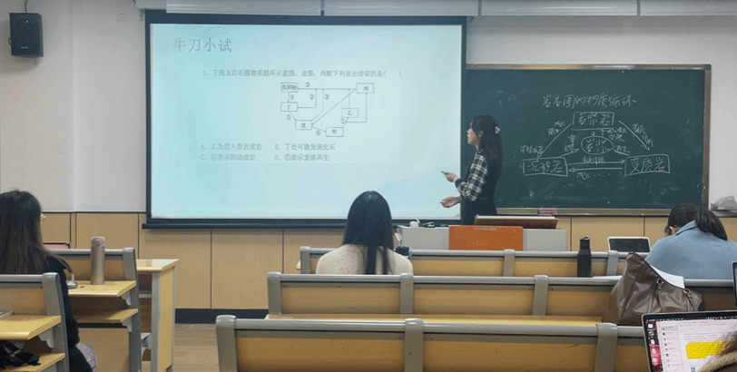 袁雪如同学讲解《岩石圈的物质循环》一课,在讲解了岩浆岩、沉积岩、变质岩三大类岩石的形成过程之后围绕本课难点岩石圈物质循环示意图进行重点展开。吴老师根据本节课针对高二年级的学情建议引入习题进行深化讲解;徐老师则关注到教材中的典型岩石图片,建议补充讲解典型岩石的特征和形成过程。