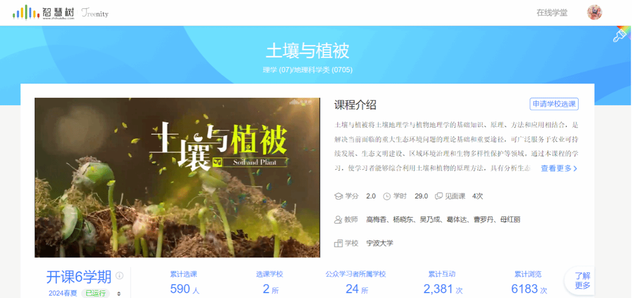 的名称为“植被与土壤”,3个学分,60个学时,采用课堂授课+实习实践+自习的学习方式,课堂授课和实习实现占比为43+17。自习采用教学团队依托智慧树平台建设的“植被与土壤”课程(//coursehome.zhihuishu.com/courseHome/1000077511/181022/20#teachTeam)。采用团队教学模式,授课者有高梅香教授、吴乃成教授、葛体达研究员、杨晓东教授、曹罗丹副研究员、罗旭讲师和母红丽助理研究员。