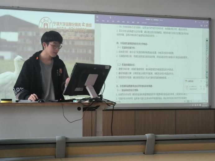 教学1班共分成5小组,围绕东钱湖这一核心区域自由选择要素并进行综合分析。经前期选题、文献阅读、大纲初稿撰写,各组代表分别在课堂上汇报本组的进展。本次课程汇报旨在考核学生小组分工的初步成果和区域分析研究的能力。