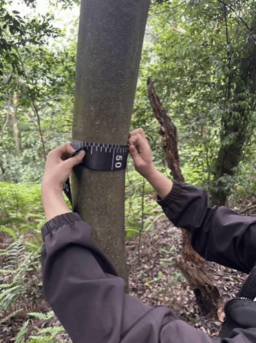 各班以4个小组为单位建立一个20m×20m的正方形样地,并用尼龙线将其划分成10m×10m的网格。各小组采用标准化调查规程展开乔木数据采集:测量物种坐标,通过目测法辨识物种组成和树高,以胸径尺环量1.3m处树干周长;同时运用估算法统计树冠投影面积(冠幅)与郁闭度。系统记录了样方内乔木层的物种多样性、空间分布格局及群落结构特征,为分析天童山群落演替提供了原始数据。