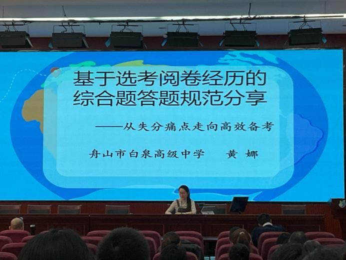 下午的分享环节同样精彩纷呈。舟山白泉高级中学黄娜老师基于选考阅卷经历,就综合题答题规范进行了详细分享。她通过分析学生答题中的常见问题,提出了针对性的改进建议,帮助学生从失分痛点走向高效备考。鄞州中学严丽娜老师则对首考选考试题进行了深入分析,揭示了试题背后的教学启示,为教师们今后的教学提供了有力指导。镇海中学魏伟老师则从选考试题归类与复习建议的角度出发,为教师们提供了实用的备考策略。