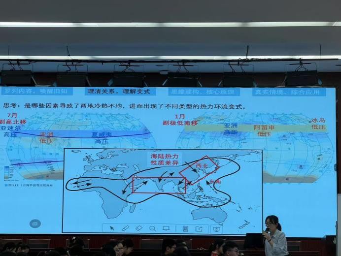 江老师则围绕《因素叠加下的大气运动解码》展开教学,从真题分析入手,提炼大尺度(如三圈环流、季风环流)和小尺度(不同因素影响下的大气运动)考点。她通过罗列内容、唤醒旧知,理清关系、理解变式,思维建构、核心原理,真实情境、综合应用等教学环节,层层递进,帮助学生系统掌握大气运动规律。江老师还设计了互动问答环节,激发了学生的思维活力。