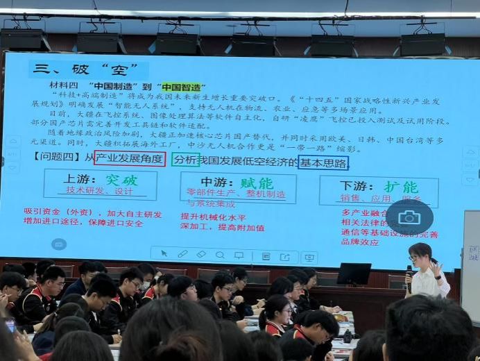袁老师为《起飞!低空经济》为题,紧扣新质生产力发展脉搏,对应产业相关的教学内容。整堂课以“杭州六小龙”和考情分析为导入,以“新‘起’-蓄‘势’-破‘空’-起‘飞’”为主线,由浅入深分析了中国无人机产业的上中下游产业链、竞争力、面临挑战及发展思路。课堂上,袁老师巧妙运用思维导图,引导学生构建知识体系,培养了学生的地理实践力与综合思维能力。
