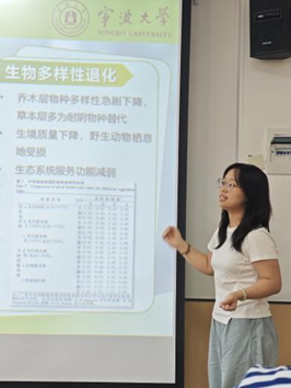 汇报过程中,各小组聚焦多元核心话题展开分享,涵盖水利工程建设的选址原因分析、毛竹入侵机制探究、四明山夷平面揭秘、区域生境质量评价,以及野外实习经历与高中地理教学衔接路径探讨等,充分展现了同学们在野外实习中的观察思考与专业探索能力。