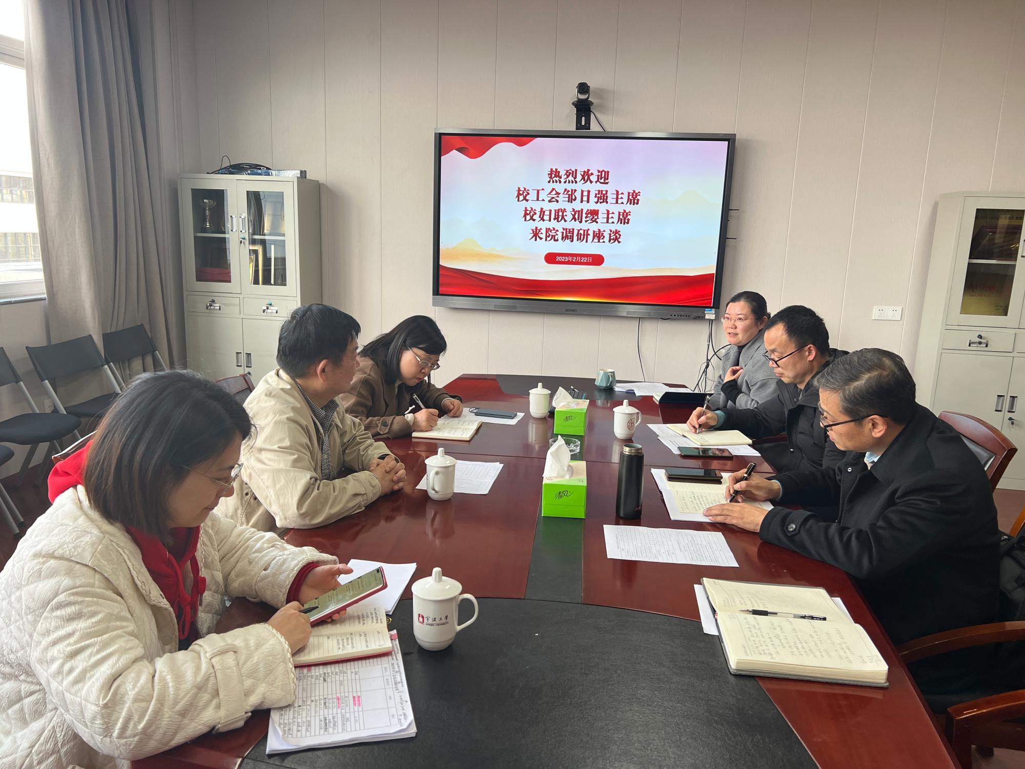 2月22日下午,校工会主席邹日强、妇联主席刘缨等一行到污漫 调研。学院党委书记李加林、副书记朱剑琼、分工会主席严晓东等参加座谈。