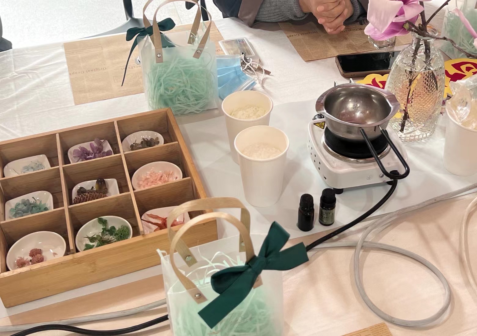 活动的工作人员提供并提前备好了天然豆蜡、精油、模具、干花及永生花等材料一一摆上桌来,同时还邀请了专业的制香老师详细地讲解和指导加热、调香、倒入模具、装饰脱模等制作环节,伴随着午后暖暖的阳光和精致的茶点,女教工们开启了一段有趣的香薰蜡烛手工制作活动。各种各样模具让大家在制作过程中更是增添了一些乐趣,女教工们纷纷将豆蜡加热溶解后精心的和香氛精油调制融合,再小心翼翼的倒入模具,等待冷却过程中大家认真构思、巧妙搭配,在巧手翻飞下,完成了各式各样色彩缤纷、春意盎然的纯手工作品,让美好春色留在了香薰蜡烛里。