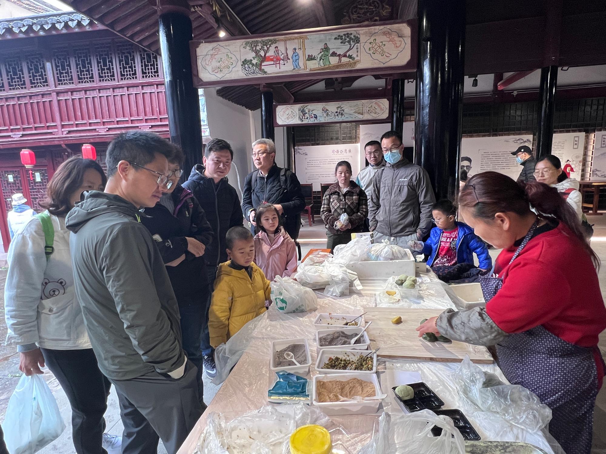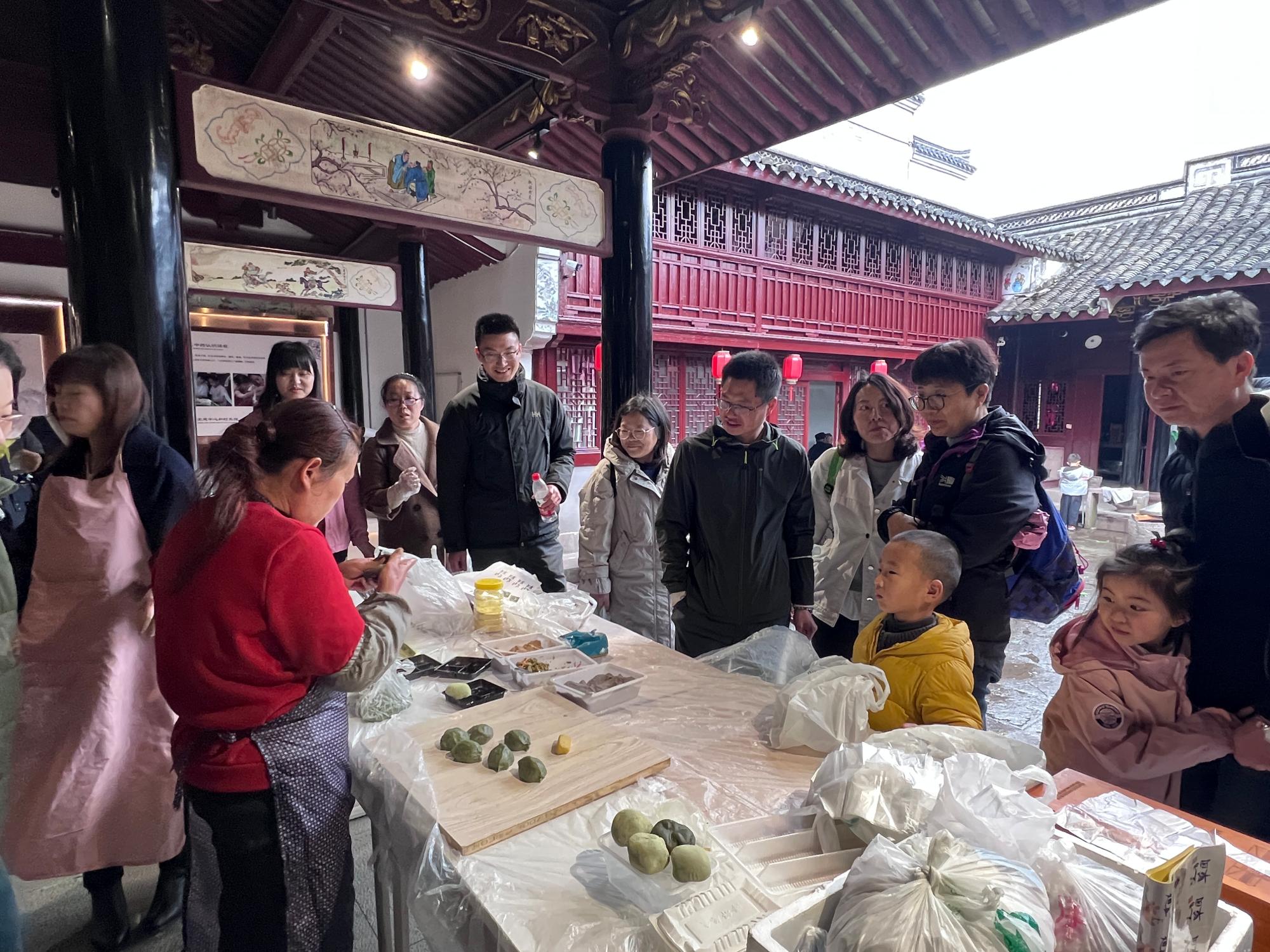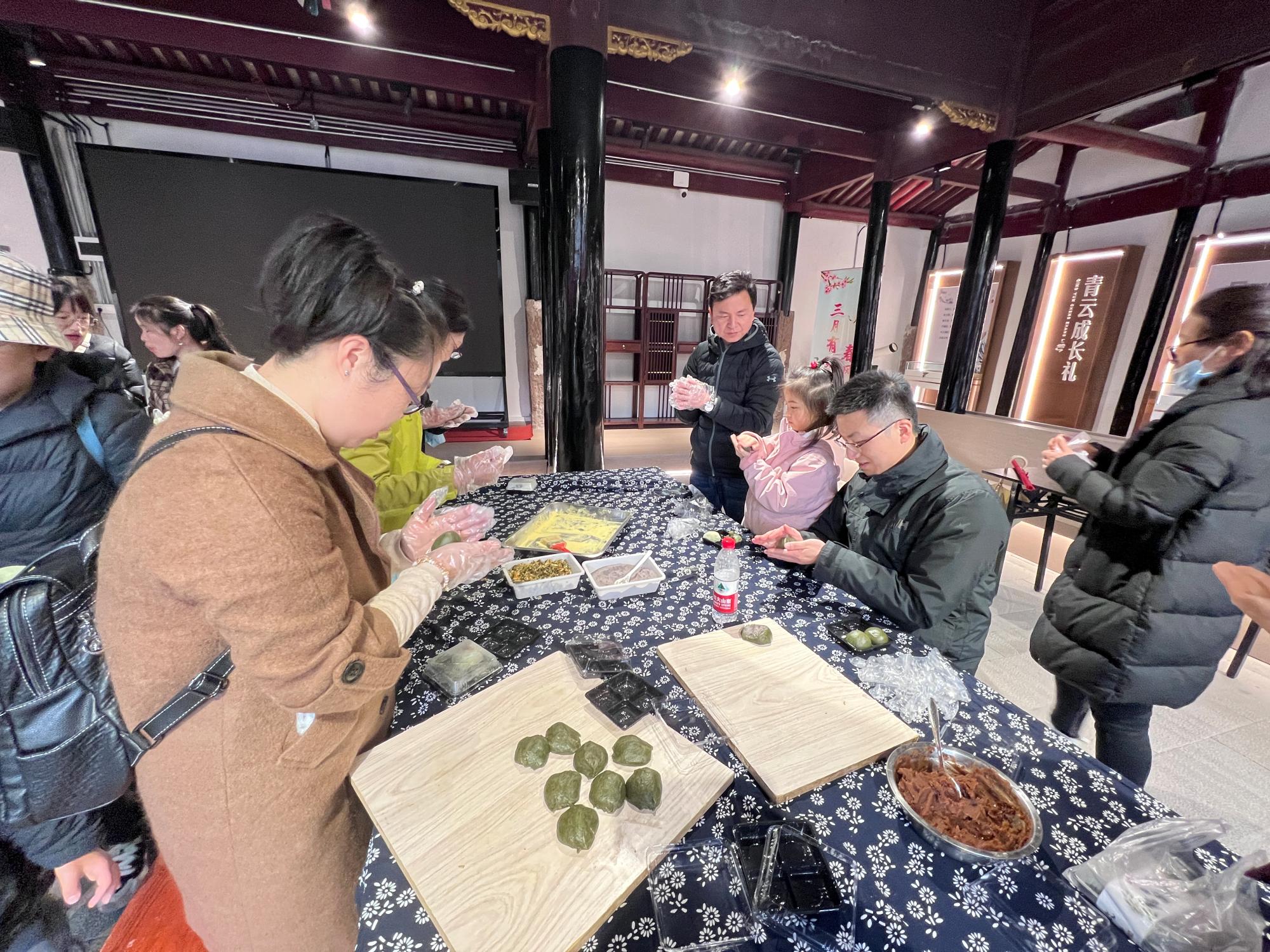 午饭后,老师们乘车前往青云古村进行参观游览。走进青云古村,门前河流经村庄,民宅依河而建,两岸香樟吐翠,亭台、廊桥古色古香,气派的洋房之间保留着一幢幢民国时期白墙黑瓦、飞檐翘角的徽派建筑。水井、老街、亭台、牌坊交相辉映,随处可见普通农家的生活场景、处处彰显着有近千年历史文化的名村韵味。随后老师们在文化礼堂里亲自动手体验传统特色小吃青团的制作,欢乐的时光很快就过去了,老师们集体乘车回到校园,愉快的春游活动告一段落。