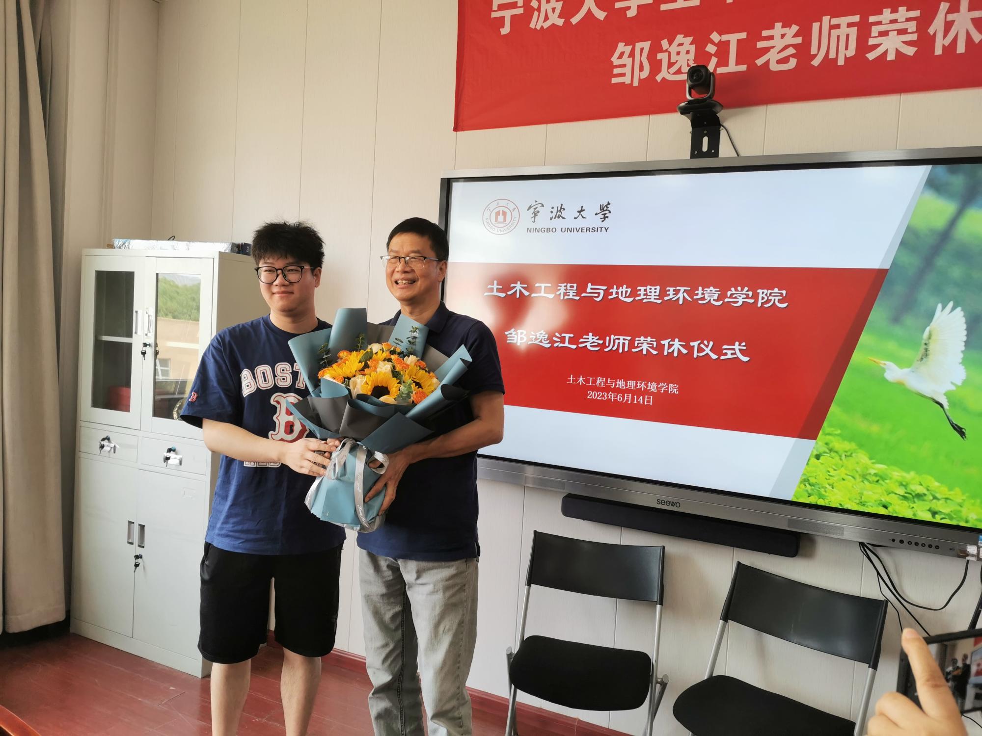 仪式上邹逸江老师发表感言。他饱含深情地回顾了几十年来工作的点点滴滴,表达了对学院教育培养、相伴成长的感恩之情和对学院领导、同事及学生的感谢与祝福,同时也展望了未来美好的退休生活。最后,林雄斌老师颁发荣休纪念品,学生代表献上鲜花并合影留念。