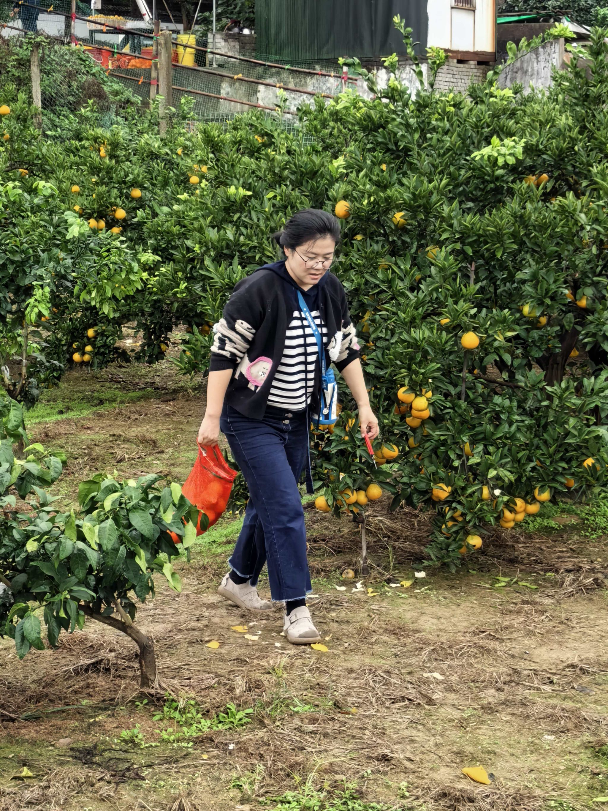 午后,队伍转场至鸣鹤山脚下的生态橘园。金灿灿的橘子挂满枝头,果香四溢。在果农指导下,教职工们领取采橘工具,开启“欢乐采摘”模式。老师们自发组成“互助小组”,高个子的负责摘取高处果实,细心的负责筛选装箱;青年教师则与资深教授搭档,交流采摘技巧的同时分享教学心得。