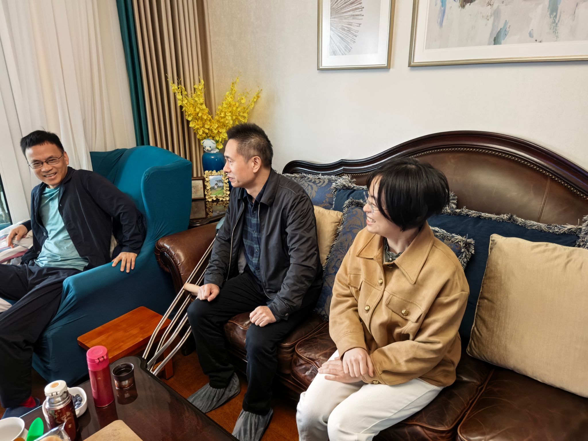 慰问组抵达李老师家中时,其家人正协助其进行术后康复训练。贺智敏老师首先转达了全院师生的问候,并详细询问了手术情况、恢复进度及家庭需求。他特别强调:“学院始终将教职工的身心健康放在首位,您只需安心休养,工作交接、课程调整等事务已由分工会统筹协调完毕。”