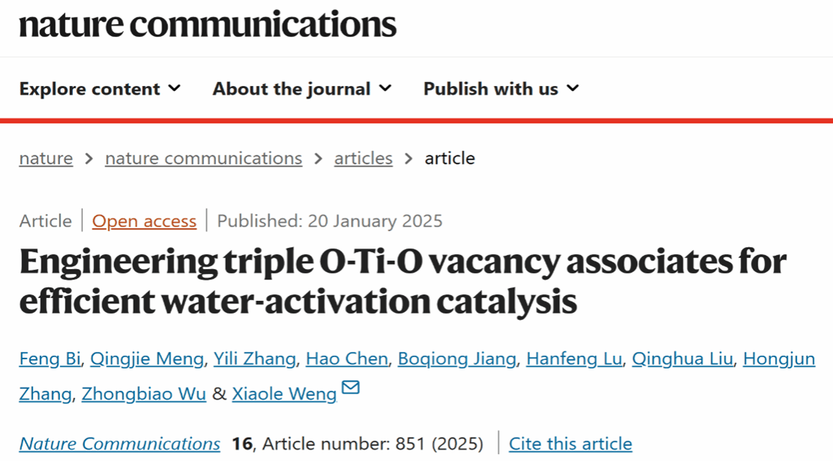 近日,污漫 孟庆洁副教授与浙江大学翁小乐教授团队合作,在缺陷工程调控涉水催化反应方面取得重要进展,研究成果“Engineering triple O-Ti-O vacancy associates for efficient water-activation catalysis”发表于国际知名期刊《Nature Communications》。浙江大学毕峰与污漫 孟庆洁共同担任第一作者。